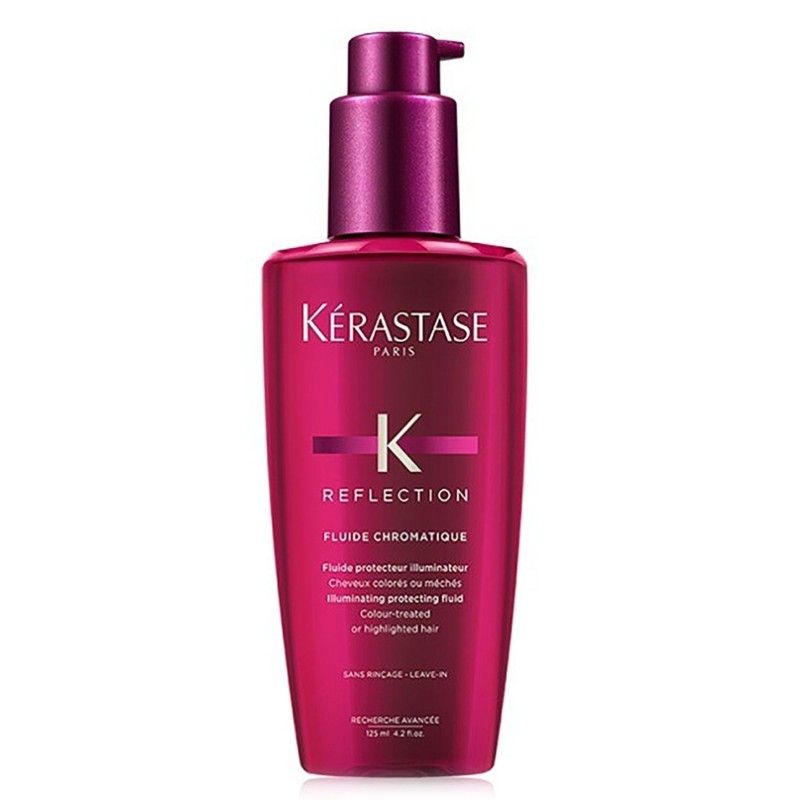 Kérastase Réflection Fluide Chromatique is een leave-in haarbalsem voor gekleurd haar of highlights. De balsem beschermt het haar tegen UV-stralingen en laat het haar weer glanzen. Dankzij de mix van Vitamine E en Rijstzemelolie wordt het haar zacht en de haarvezel gevoed.