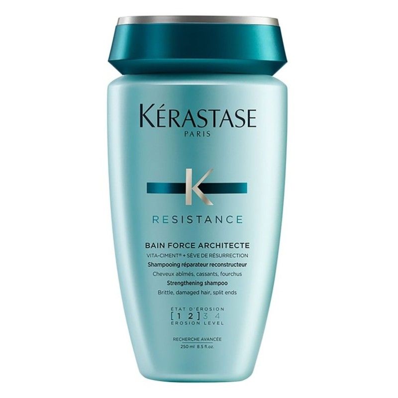 Kérastase Résistance Bain Force Architecte Shampoo is een versterkende, herstellende shampoo voor breekbaar, beschadigd haar met gespleten haarpunten. De shampoo helpt bij het herstellen van de haarvezel en gaat splijten van de haarpunten tegen. Kérastase Résistance Bain Force Architecte Shampoo geeft het haar een natuurlijke glans en een zijdezacht gevoel. De shampoo herstelt de haartextuur en reinigt het haar intensief.